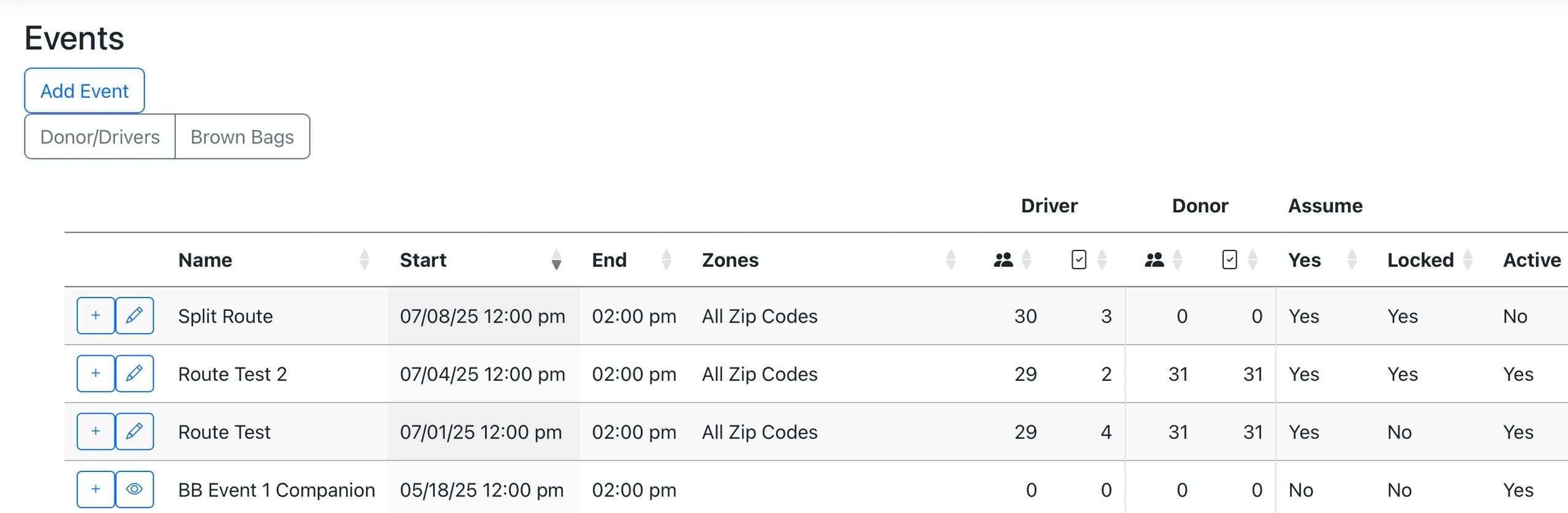 Event Locked; When the routes are run, this is set to True. Once set to true donors and drivers cannot change their status, they get an email saying "event is locked, contact Event Manager". You can set this to false (unlocking the event) if you wish. Just be careful, if routes have been run this can cause a lot of issues since donors will have changed their status. If a donor cannot donate and they tell you after the route has been run, you can manually set them to "no", and the driver will see that real-time on their route app.