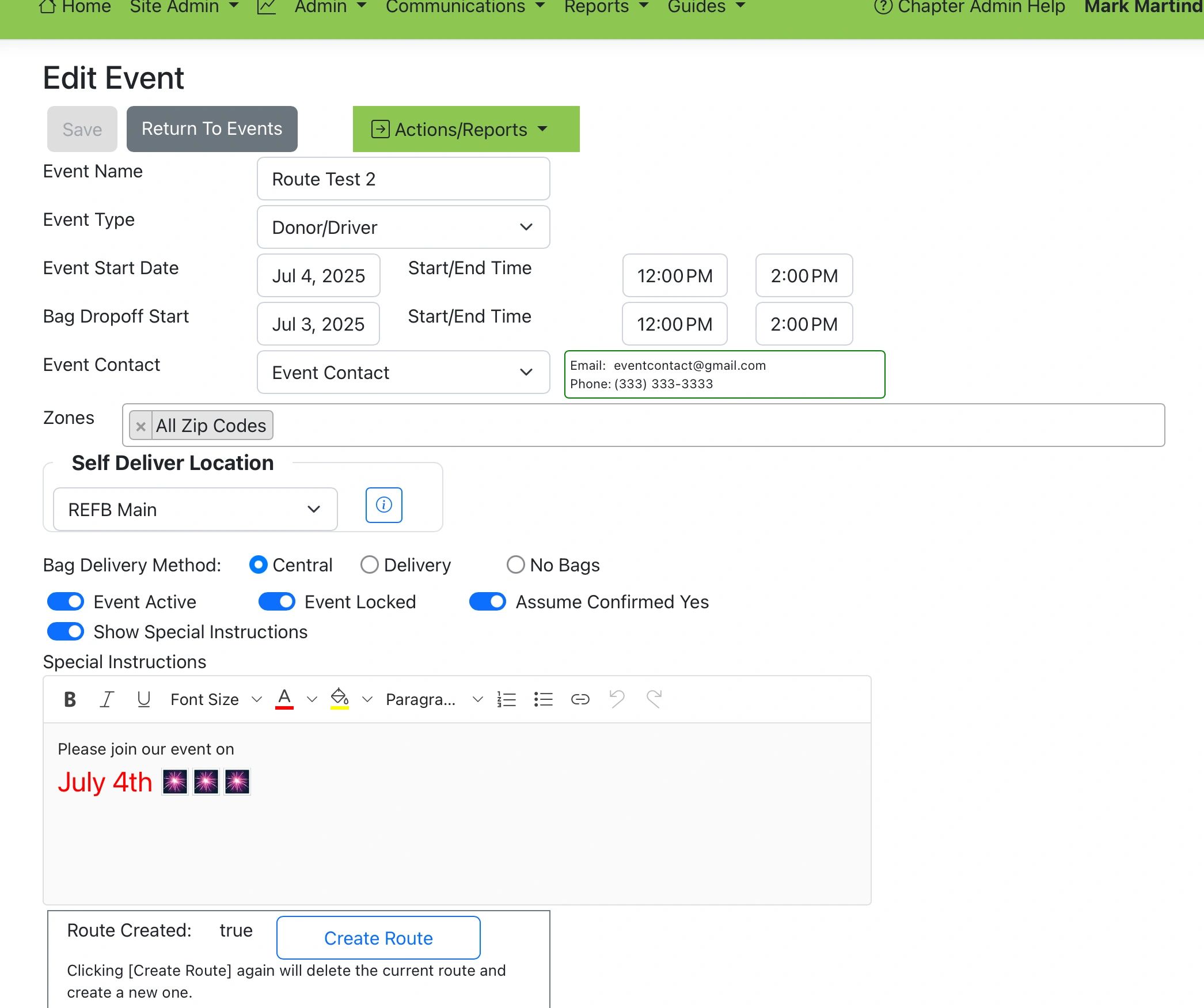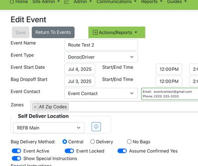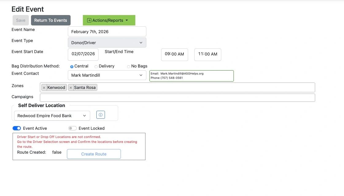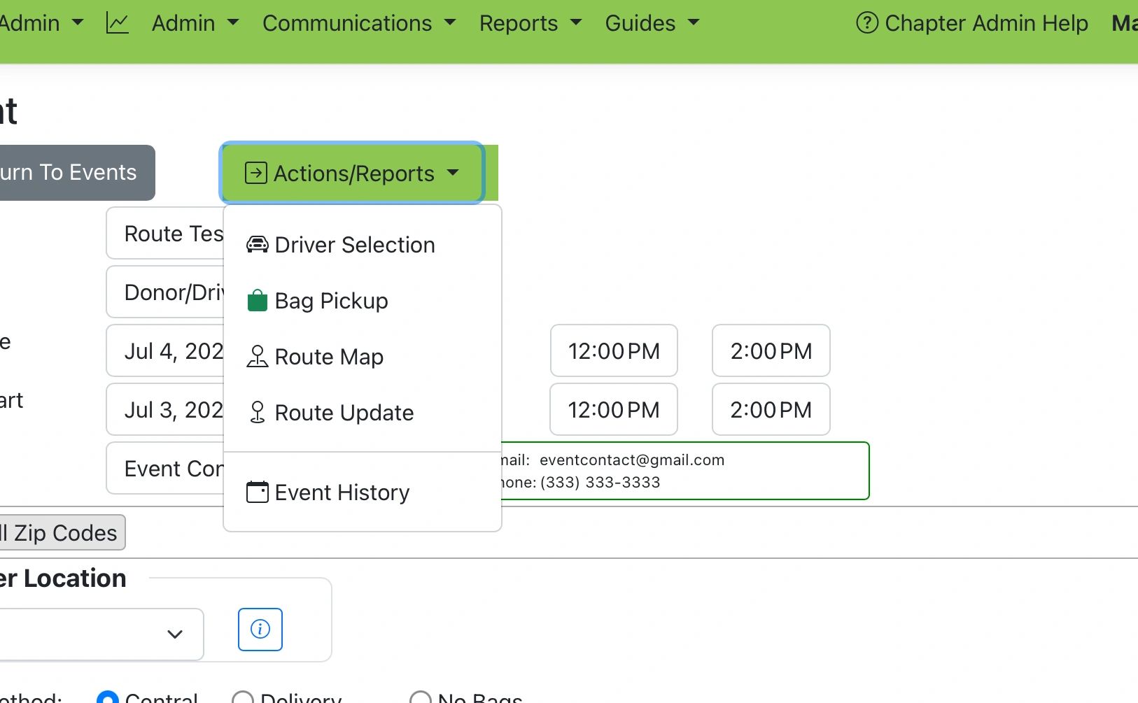The Actions/Reports drop down provides other tools related to an event. Driver Selection sets up drivers. Bag Pick up handles bag delivery to drivers. Route Map provides the routing details. Route Update allows Admin to update route data for each driver. And Event History shows data related to drivers and donors.