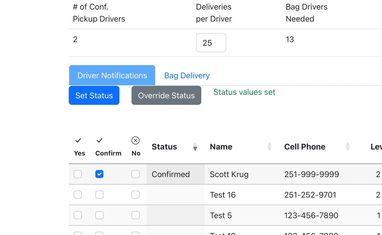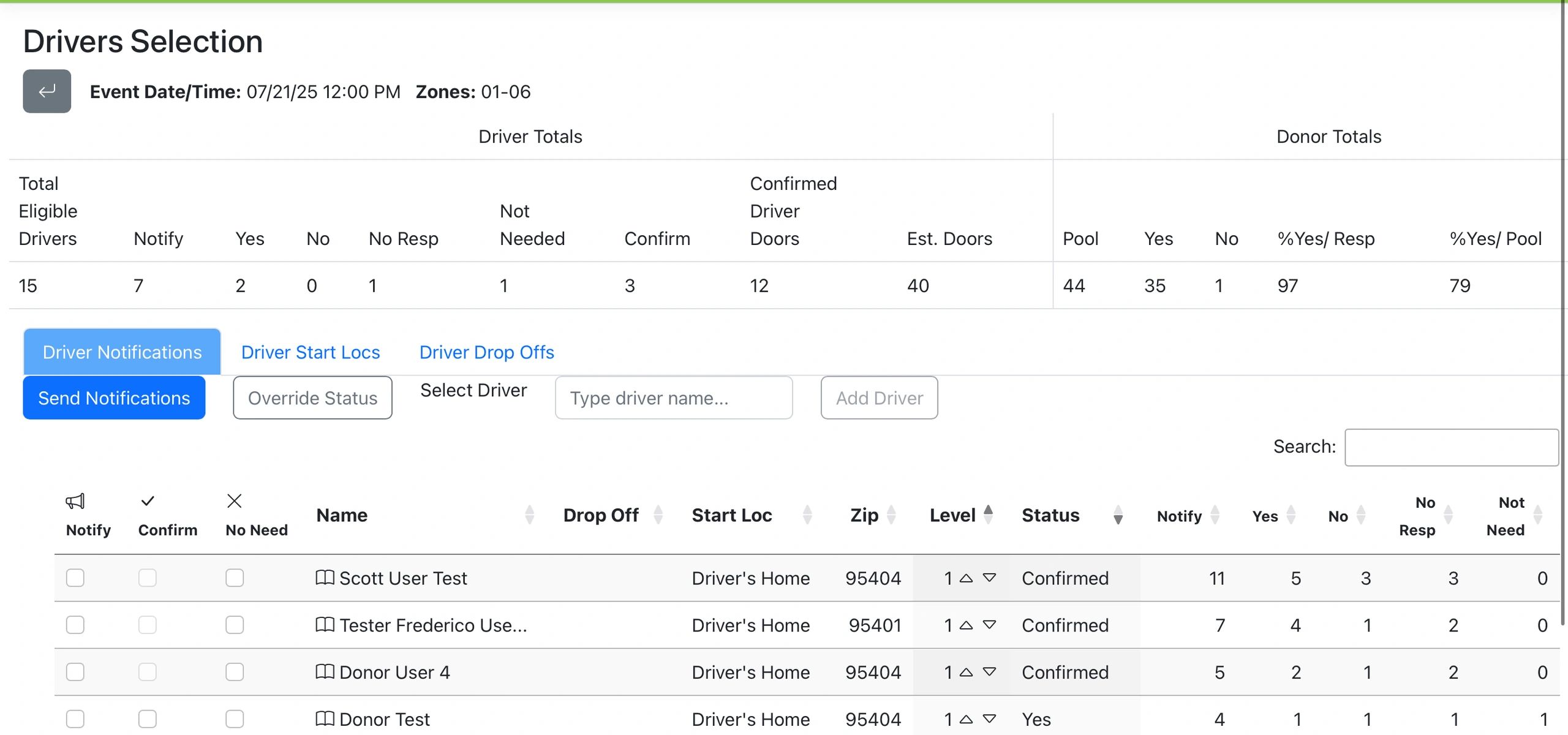 First; determine how many drivers you will need, send them notifications and confirm their willingness to participate. You can also “Override Status” and set specific drivers as confirmed.